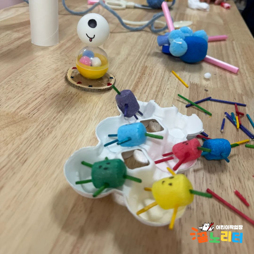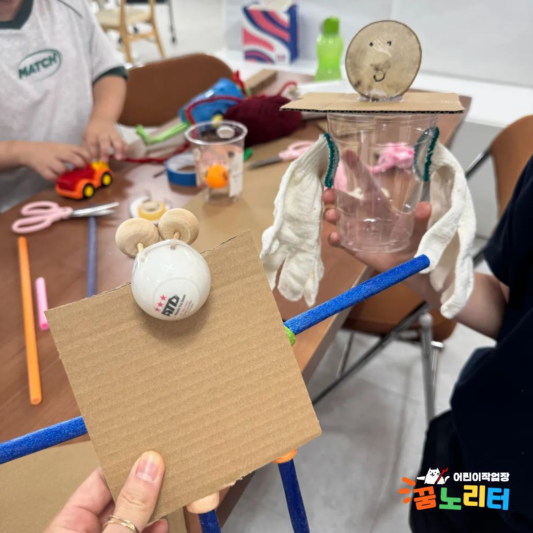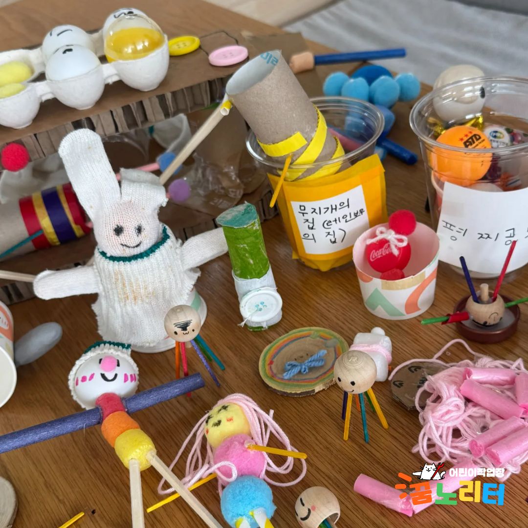 "우와!" 아이들의 탄성을 자아낸 것은 바로 꿈노리터의 재료들이었습니다. 플라스틱 컵, 병뚜껑, 탁구공, 골판지, 털실, 천 조각 등 평범한 재료들이 아이들의 손을 거쳐 특별한 인형으로 재탄생할 준비를 하고 있었죠.